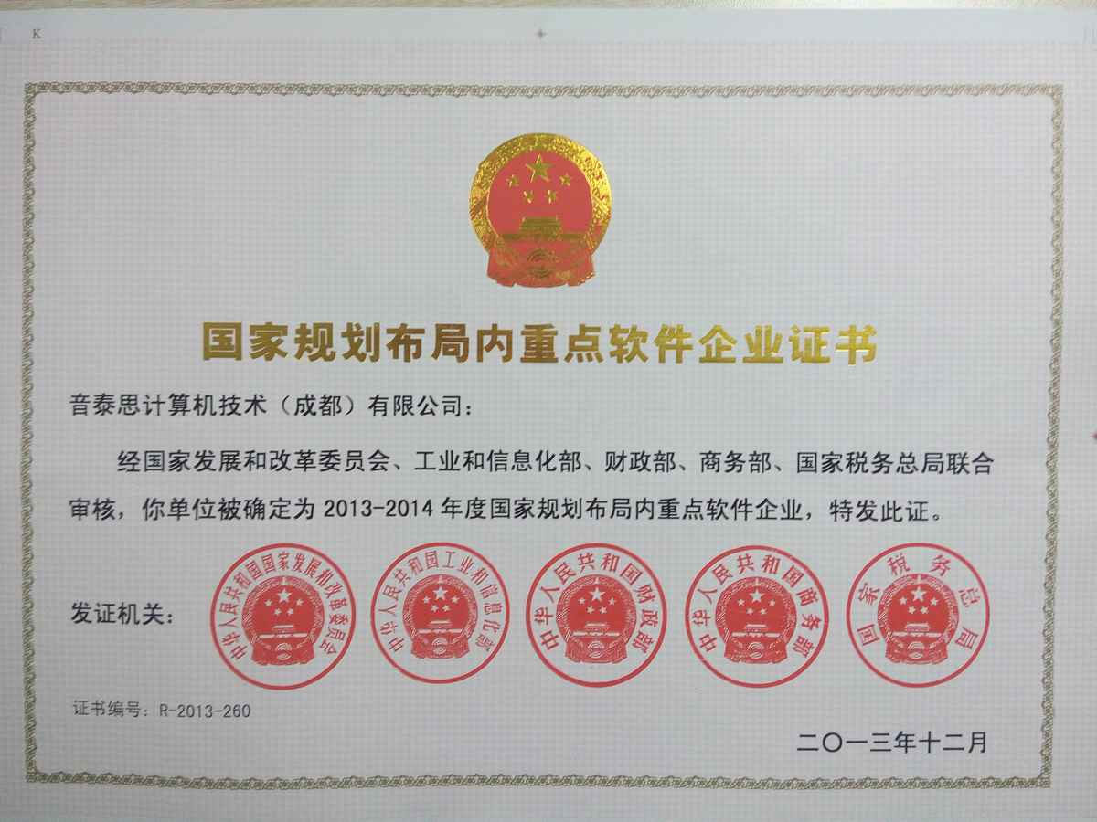 获2013-2014国家规划布局内重点软件企业称号