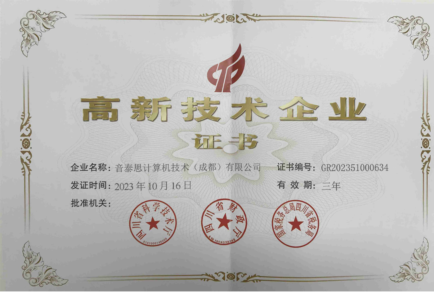 国家高新技术企业证书