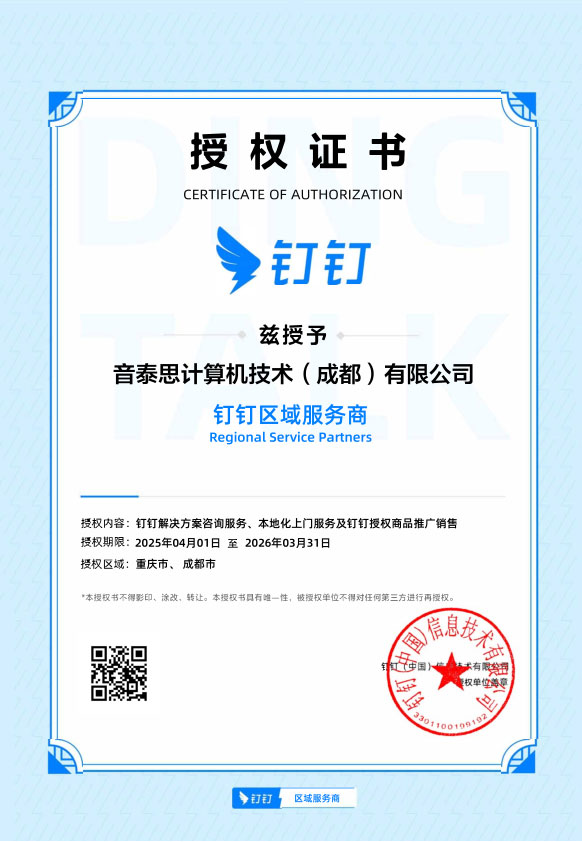 钉钉区域服务商授权证书